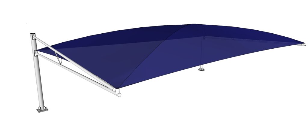Este modelo de toldo apresenta a solução ideal para sombreamento de uma área mais estreita e circunscrita.O modelo de toldo Meio Robot é constituído por 2 postes traseiros e uma pala, com tela em forma de abóbada. Este modelo de toldo é construído em ferro de secção tubular com tratamento anti-oxidação e posteriormente lacado. Podem ser aplicadas telas em PVC nas variantes sombra ou impermeável, com tratamento UV e em cor à escolha do cliente.